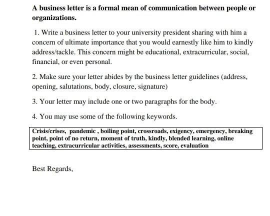 The body of a letter usually. Formal letters are almost exclusively external forms of written communication, but are also useful for the internal communications. In case it is a business to business communication, these letters can also be drafted in the respective company's letterhead. The overall style of letter depends on the relationship between the parties concerned. To begin with, business letters should be written on the company's letterhead.